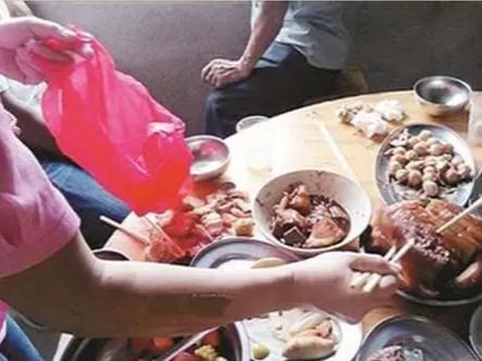 在酒桌吃饭途中,就有人在议论,桌上那个菜肉拿回家去,比如说桌上四个肉菜,这里包括一盘烧鸡、一盘肘子、一盘烤羊腿、一盘扣肉,这些都是人家打包人的选择。