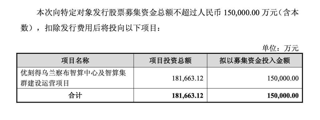 公告显示,此次项目是优刻得拟在乌兰察布察哈尔高新技术开发区现有土地进行建设,建筑内容主要包括D、E两栋AIDC并购置配套高性能AI服务器等设备。项目建设完成后主要提供高功率机柜、智能算力、通用算力等一揽子AI基础设施及算力产品等综合解决方案,服务于下游广泛的AI行业客户。项目投资总金额18亿元,主要包括智算中心及智算集群建设所需的建筑工程、机电工程、高性能AI服务器及配套硬件设备等支出。其中,拟以募集资金投入15亿元。
