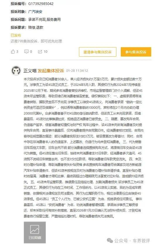 截至2026年2月25日,已有40余名消费者集中投诉该广汽埃安4S店虚假承诺骗资、篡改合同、延误补贴申请等多项侵权行为,单人经济损失1万至3万元,累计损失达数50万元。