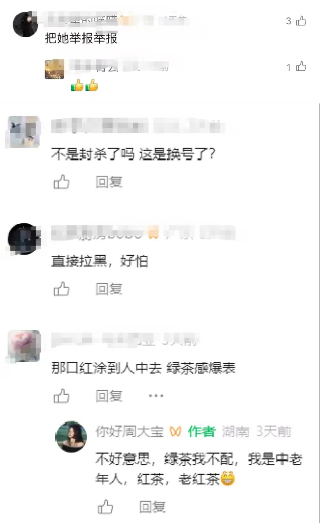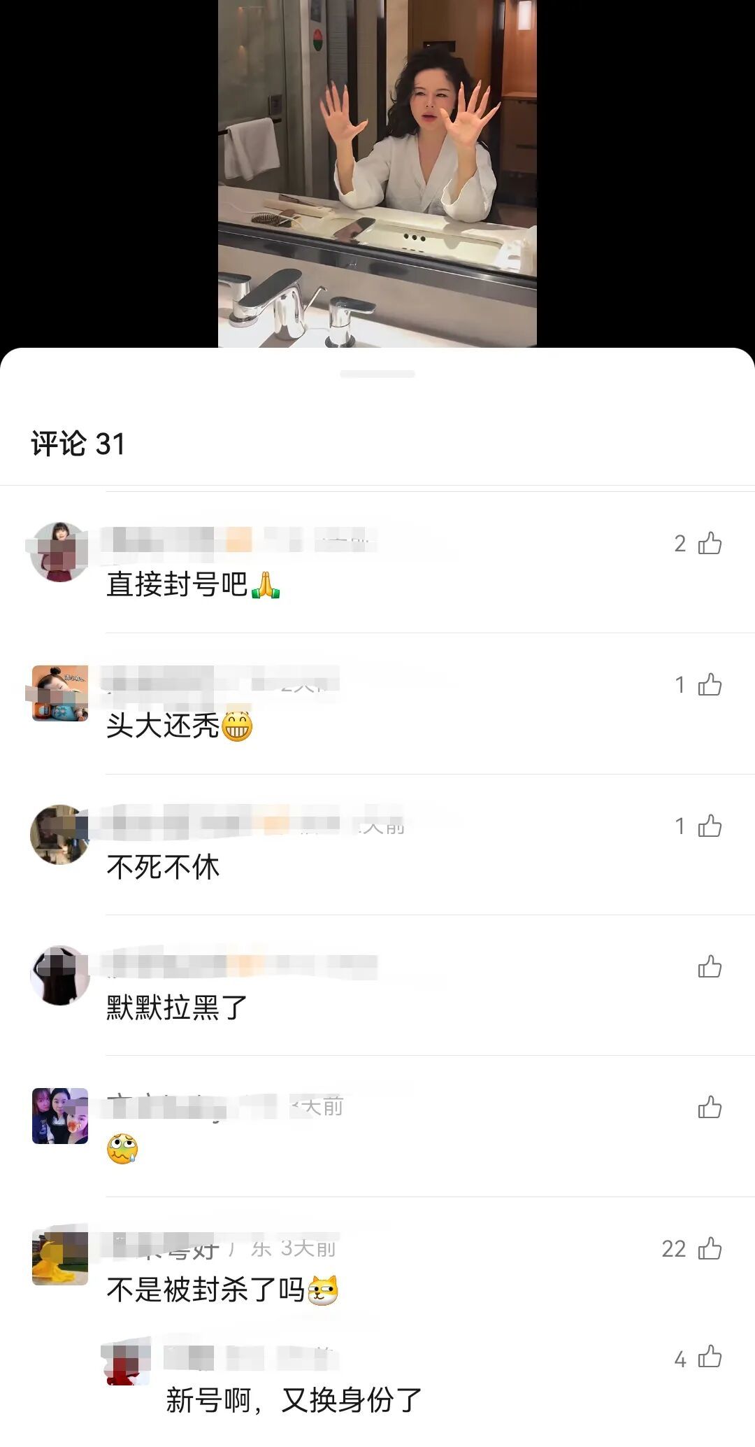 有不少刷到周媛视频的网友,在视频下纷纷留言:“直接封号吧”“默默拉黑了”“新号啊,又换身份了”。
