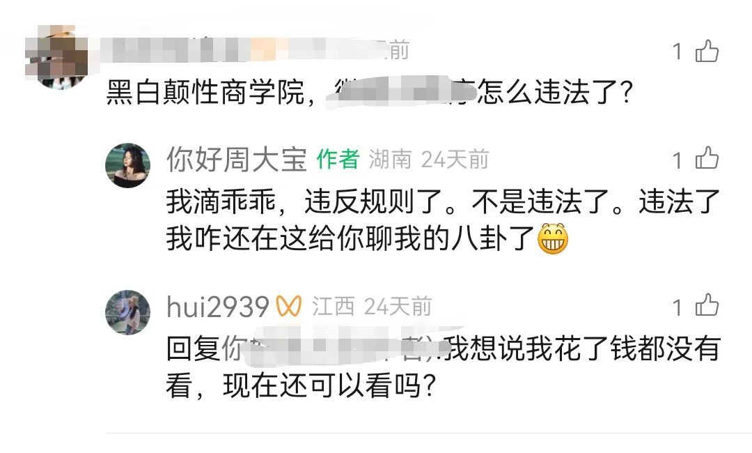 此外,还有网友在评论区询问“黑白颠性商学院,怎么违法了?”周媛回复称:“违反规则了,不是违法了。违法了我咋还在这给你聊我的事呢。”这一回应,既透露了其被封禁的一部分原因,也是在为自己正名。