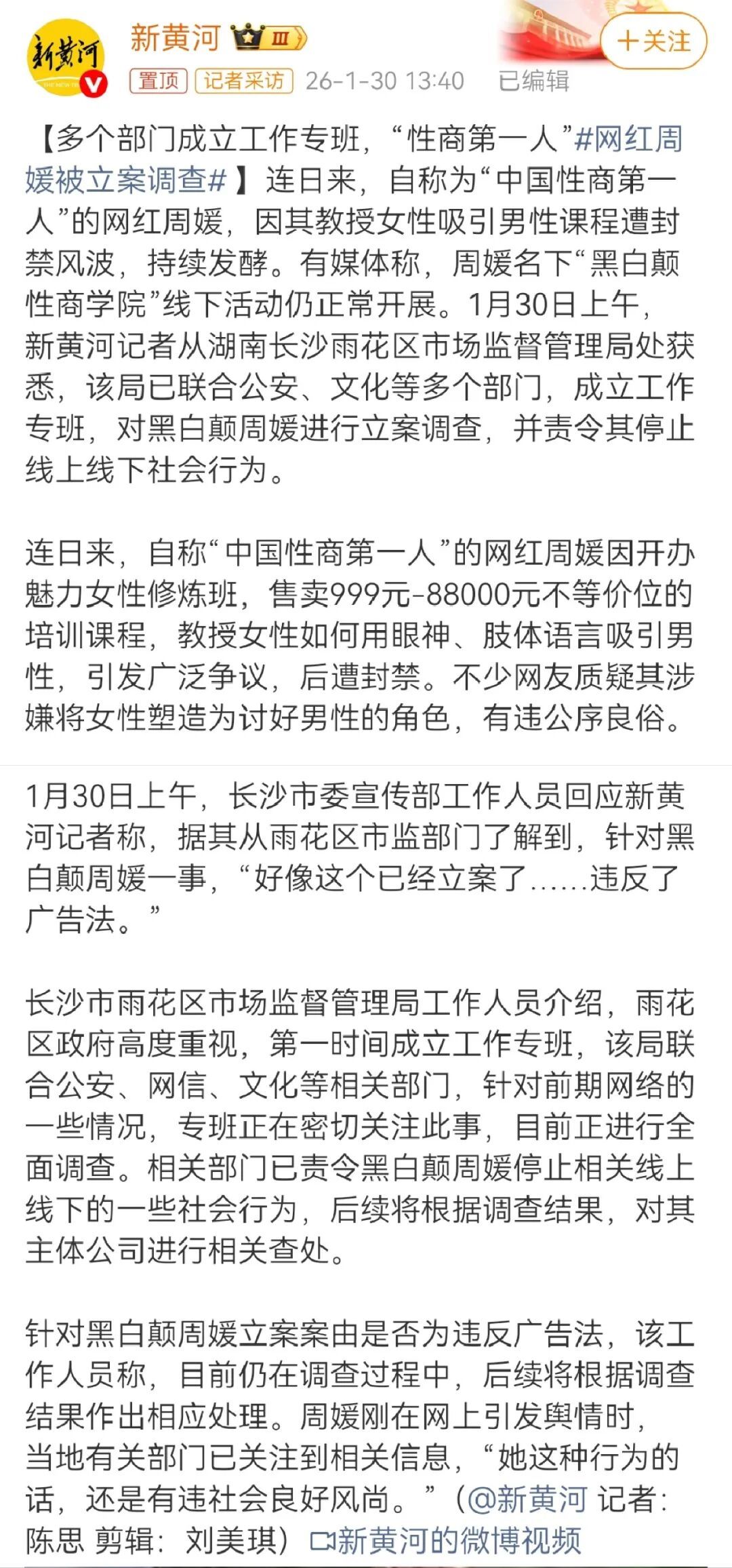没多久,周媛的抖音账号被封禁。与此同时,据新黄河报道,周媛被相关部门立案调查,并被责令停止线上线下相关活动。
