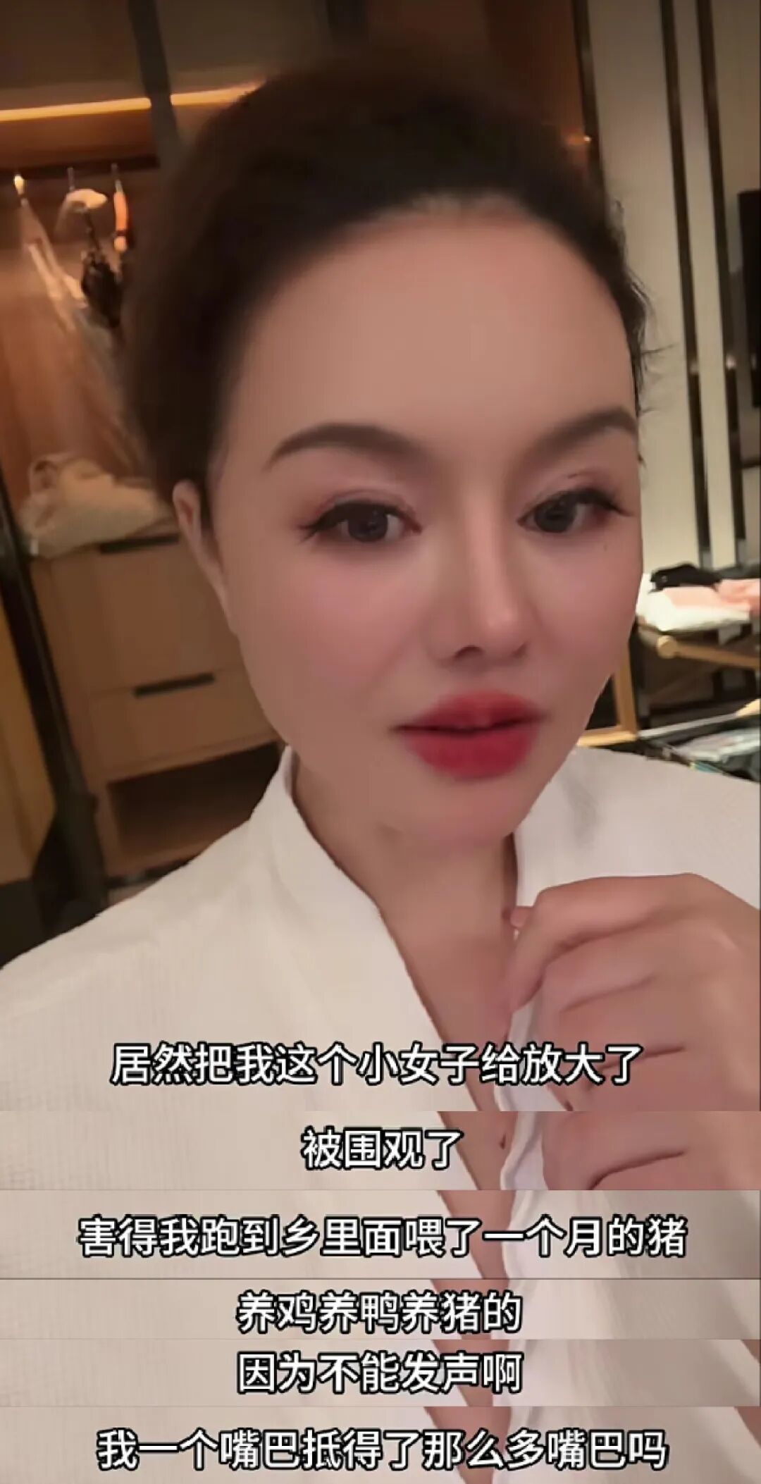 她还在视频中调侃,本来“眼神给出去”视频爆火,大家玩梗挺好的,没想到被放大,害得她跑到乡下喂猪一个月。她还有些无奈的抱怨:因为不能发声啊,我一个嘴巴抵得了那么多嘴巴吗。