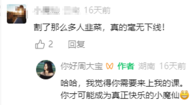 周媛为这些课程包裹上了一层“女性成长”的外衣。但实际上,这层外衣底下是低俗擦边、功利化敛财的本质。因为课程核心是教授女性用低俗肢体语言、眼神技巧吸引男性,涉嫌物化女性、传递扭曲价值观,引发全网声讨。