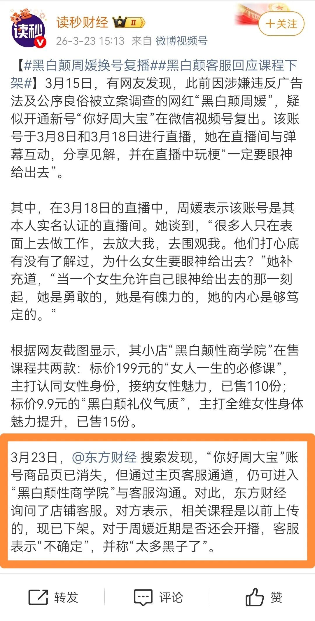 更新视频开直播外,周媛的店铺也有新情况。据读秒财经消息,其小店“黑白颠性商学院”在售课程共两款:标价199元的《女人一生的必修课》已售110份,标价9.9元的《黑白颠礼仪气质》已售15份。看来,虽然周媛已经塌房,但相关课程仍有受众群体。