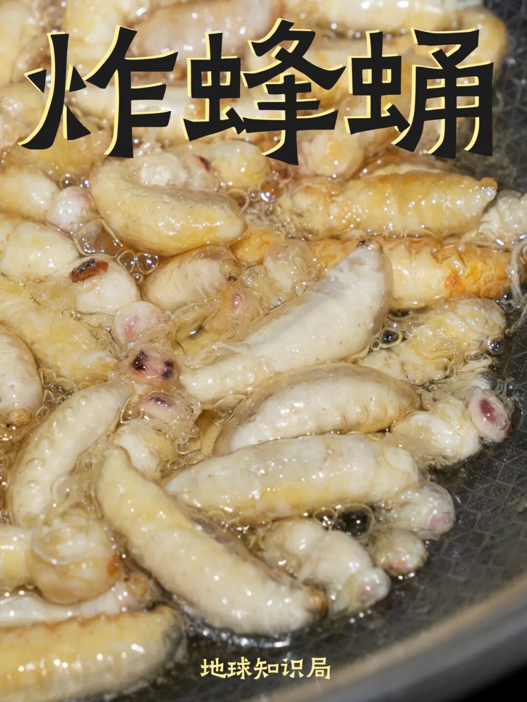 油温烧到六成热,蜂蛹下锅,蛋白质遇到油锅迸发出焦香,不一会表皮就会鼓起细密的小泡,颜色也从乳白变成诱人的金黄。捞出来沥干油,那味道能充满整个屋子。