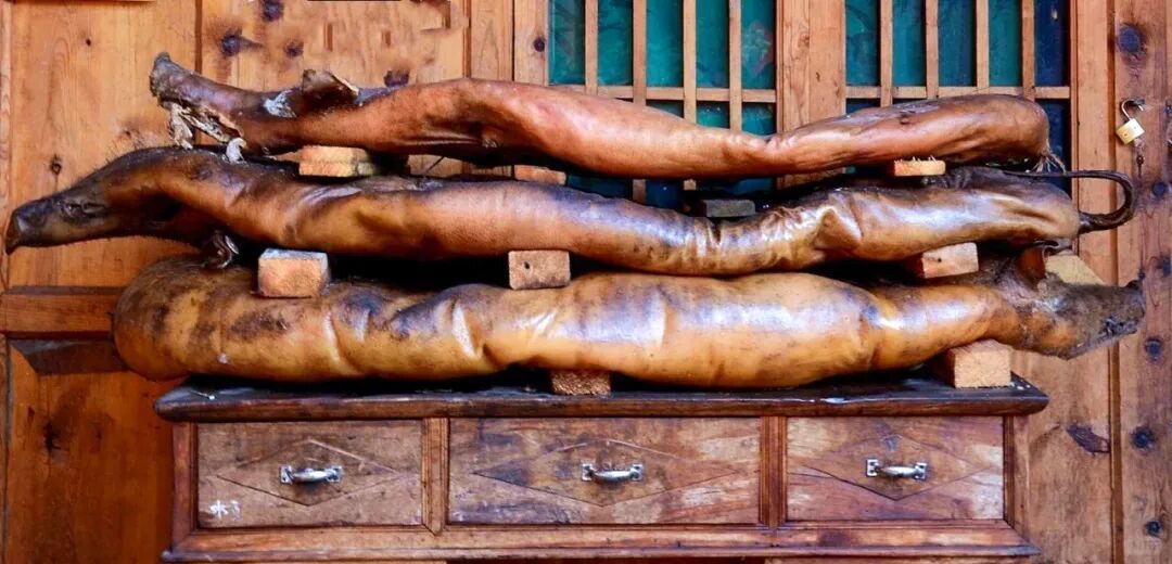 你能想象一整头萎缩的猪作为食物的样子吗?从皮到肉都保持着猪本身的质感,常年腌制让猪身表面呈现出一种蜡黄色,这是它作为食物的标志,能看出腌制腊肉的样子。