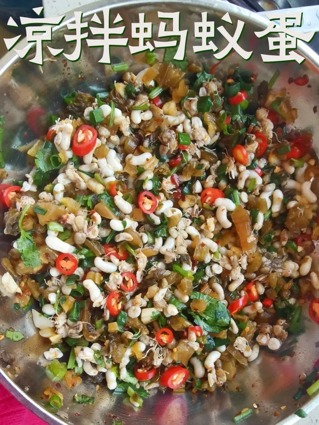 新鲜蚁蛋用温凉白开轻冲,不能用热水、不能使劲搅,不然就老了。小米辣和大蒜舂成泥,加香柳、薄荷、柠檬叶碎,滴点鱼露调酸辣汁,浇在蚁蛋上拌匀。吃着没虫腥味,酸香够劲儿,入口滑嫩,还带点小弹感。
